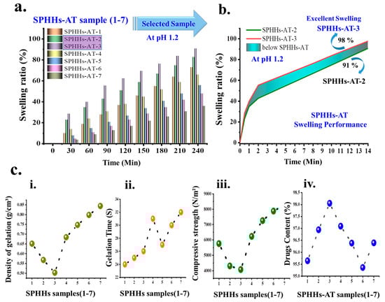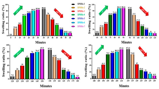 2.5. pH-Responsive Swelling of SPHHs-AT
