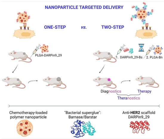 Thus, using barstar-DARPin9_29 and barnase-conjugated polymer PLGA nanoparticles loaded with the fluorescent dye, Nile Blue, and chemotherapeutic drug, doxorubicin, we showed successful bioimaging and tumor elimination in vivo. Namely, the developed two-step DDS based on barnase*barstar showed superior efficiency in image-guided cancer therapy: HER2-positive tumors’ treatment tests showed the tumor growth inhibition index TGI = 68.4% for one-step DDS and TGI = 94.9% for two-step DDS. The obtained results demonstrate the significant superiority of two-step drug delivery over classical one-step delivery. We expect these data to change the paradigm in next-generation drug development and enable researchers to focus on multi-step targeted drug delivery to reduce the required dose in cancer therapy.