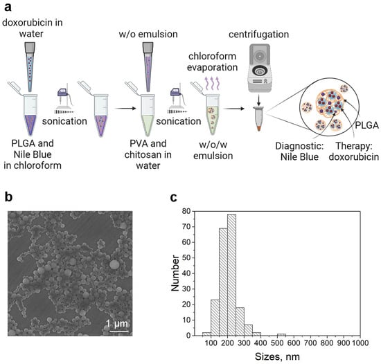 The synthesis of PLGA nanoparticles is based on a double “water-oil-water” microemulsion technique (Figure 2a). Doxorubicin is incorporated into the nanoparticle structure through the first “water” phase, while Nile Blue is incorporated into the “oil” phase [27].