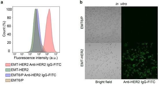 To assess the efficacy of one-step and two-step DDS for oncotheranostic PLGA delivery in vivo, we developed a mouse tumor model with the human oncomarker HER2 overexpression. For this, mouse mammary cancer cells EMT6/P were transduced with transmembrane receptor HER2 via a lentiviral transfection system, and a single clone of the resultant cells was selected and grown. The HER2 expression in the obtained cells, EMT-HER2, was confirmed with flow cytometry, as shown in Figure 3a and confocal laser scanning microscopy, as shown in Figure 3b. EMT-HER2 cells were stained with the anti-HER2 monoclonal antibody, trastuzumab, and conjugated to fluorescein isothiocyanate, FITC (anti-HER2 IgG-FITC). Data presented in Figure 3 confirm that EMT-HER2 is specifically and selectively labeled with anti-HER2 IgG with no non-specific binding.