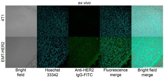Next, these EMT-HER2 cells were s.c. injected into the right flank of BALB/c mice in full culture medium and the dynamic of tumor growth was monitored with caliper measurements. After the tumor size reached ~200 mm3, the cryosections of the tumor were performed and stained with anti-HER2 IgG and Hoeschst33342, as shown in Figure 4. Data presented in Figure 4 confirm that these cells stably express receptor HER2 both in vitro and in vivo in immunocompetent BALB/c mice.
