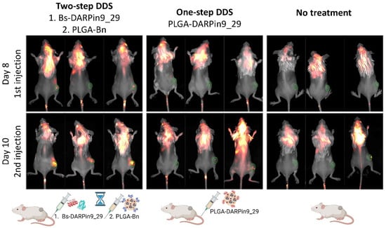 (i) For the study of one-step DDS efficacy in vivo, the injection of the conjugate of PLGA nanoparticles with DARPin9_29 was performed, namely, mice received an i.v. injection of 500 µg of the conjugate of PLGA-DARPin9_29 on days 8 and 10 of the treatment;