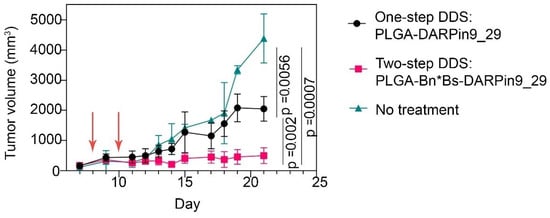 EMT-HER2 tumor growth dynamics under the treatment with one-step DDS, PLGA*DARPin9_29 particles, or two-step DDS, Bs-DARPin9_29 and PLGA-Bn (n = three mice for each group). Red arrows indicate the nanoagent injections.