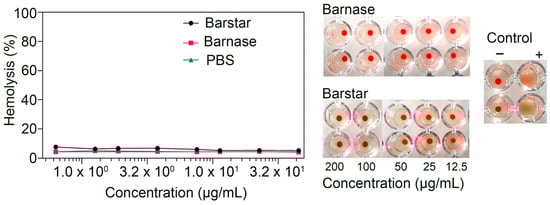 To study hemotoxicity, in particular, possible hemolysis and hemagglutination, mouse erythrocytes were incubated with proteins, namely, barnase or barstar at various concentrations. The amount of released hemoglobin was assessed by measuring the absorbance at a wavelength of 540 nm, and the value obtained was expressed as a percentage of the absorbance of the positive control sample (complete lysis), as described in detail in the Section 2. It was shown that all tested proteins in a wide range of concentrations do not cause the hemolysis of erythrocytes (Figure 7). Hemagglutination studies were performed in U-shaped 96-well plates. For this, mouse red blood cells were incubated with proteins: barnase or barstar at various concentrations in U-shaped plates. In the case of hemagglutination, blood cells did not settle at a point in the center of the well and formed a film over the entire surface. It was shown that all tested proteins in a wide range of concentrations do not cause hemagglutination (Figure 7).