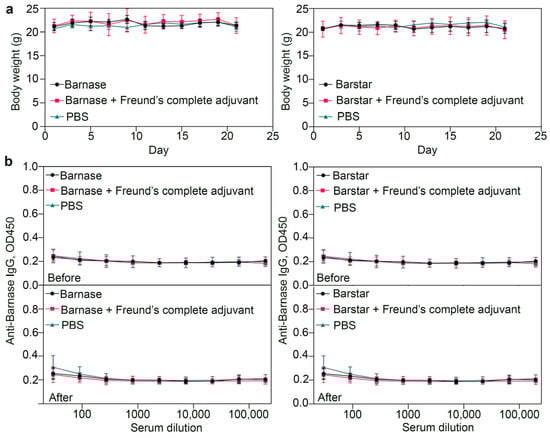 The results of the enzyme-linked immunosorbent assay, namely, the number of antibodies, depending on the serum dilution for mice injected with the proteins barnase or barstar for the main and control groups, are shown in Figure 8b. The data presented in Figure 8b indicate the absence of a specific immune response in mice for the tested proteins on day 21 after the first injection even with the “boosting” the immune response by injecting proteins in a mixture with complete and then incomplete Freund’s adjuvant. At the same time, the weight of the animals (Figure 8a) did not change significantly throughout the entire experiment for all experimental groups. The obtained data indicate the possibility of multiple administrations of the studied proteins without serious risks associated with the specific B-cell immune response of the organism.