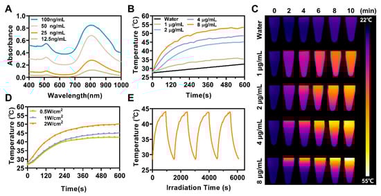 The photothermal response of ASCP NPs. (A) The UV-visible spectrums for different concentrations of ASCP NPs. (B) The temperature elevation curve and (C) the temperature gradience of ASCP NPs in different concentrations under laser irradiation (808 nm, 1 W/cm2) for 10 min. (D) The temperature elevation curve of ASCP NPs (2 µg/mL) under laser irradiation with different power densities for 10 min. (E) Photostability of ASCP NPs (2 µg/mL) evaluated by performing the lasering and cooling cycle several times.