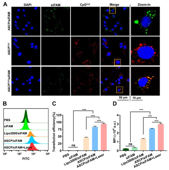 Intracellular uptake of siRNA and CpG ODN co-delivered by ASCP NPs in MC38 cells. (A) Fluorescence images of MC38 cells transfected with the NPs of ASCP/siFAM, ASCPCy3 and ASCPCy3/siFAM for 4 h. Blue: cell nuclei were stained by DAPI, green: siRNA labeled with FAM (siFAM), red: CpG ODN labeled with Cy3 loaded in ASCP (ASCPCy3), merge: DAPI + FAM + Cy3, scale bar = 50 μm. (B) Flow cytometry detected the transfection efficiency results of ASCP/siFAM NPs prepared at the weight ratio of 7.5:1 in MC38 cells. (C) Quantitative analysis of transfection efficiency rates and mean fluorescence intensity (MFI) recorded in panel (D). All data are expressed as the mean ± SD (n = 3. Statistics were done using one-way ANOVA with Tukey multi-comparisons. *** p < 0.001 and ns, no significant difference).