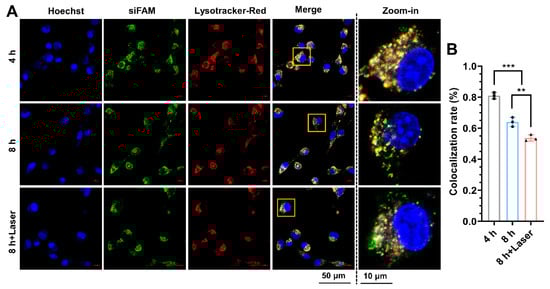 Numerous reports provide evidence that only 1–3.5% of siRNA endocytosed by cells could successfully escape from the endo-lysosome and trigger RNAi []. Most of the remaining siRNA that did not escape were rapidly degraded in the acidic environment of endo-lysosome [,], which limited the initiation of RNAi to effectively silence target genes, resulting in unsatisfactory therapeutic effects []. Therefore, effective siRNA endo-lysosomal escape is important for improving the gene silencing efficiency and therapeutic effect []. To investigate the siRNA endo-lysosome escape efficiency assisted by ASCP, the subcellular localization of ASCP/siFAM NPs in MC38 cells with or without irradiation was observed under a CLSM (Figure 4A). The statistics in Figure 4B showed that the mean colocalization coefficient of siRNA and endo-lysosome of ASCP/siFAM NPs was 0.810 at 4 h post-transfection. In contrast, the colocalization coefficient decreased to 0.640 at 8 h after transfection. Notably, an additional 10 min-mild photothermal heating condition provided by the 808 nm laser (0.5 W/cm2) further reduced the colocalization coefficient to 0.537 (Figure 4B). The endo-lysosomal escape efficiency was negatively correlated with the colocalization coefficient. These results have proven that ASCP could not only effectively assist siRNA in achieving endo-lysosomal escape, but also mediate mild photothermal heating to enhance endo-lysosomal escape further.