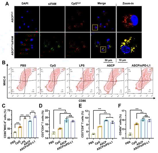 As professional antigen presenting cells (APCs), mature DCs bridge innate immunity and adaptive immunity by presenting antigens to lymphocytes []. The activation of DC maturation is necessary for T cell-mediated anti-cancer immunity []. CpG ODNs can be recognized and bound by TLR9 expressed by DCs, which promotes the maturation and antigen presentation ability of DCs and initiates a T cell-mediated anti-cancer immune response []. ASCP-based NPs were expected to promote DC maturation and initiate the T cell-mediated anti-cancer immune response by releasing CpG ODN. To test the activation effect of ASCP-based NPs on DCs, mouse BMCs were isolated and co-induced to prepare BMDCs using IL-4 and GM-CSF according to the method reported by Tang et al. []. After induction, the changes in the cell morphology (Figure S12) and the significant increase in CD11c+ expression detected by flow cytometry (Figure S13) indicated that BMDCs were successfully prepared. Then, confocal fluorescence images obtained after BMDCs were co-incubated with ASCPCy3/siFAM NPs for 4 h, which indicated that these NPs could be successfully taken up by the DCs (Figure 5A). Next, the different formulations of NPs were incubated with BMDCs for 24 h with LPS as the positive control. Furthermore, the effects of these NPs on activating BMDCs maturation were evaluated by flow cytometry analysis with CD86 and MHC-Ⅱ as the surface markers for mature DCs (Figure 5B). The maturity of BMDCs (CD86+MHC-II+%) in the negative control PBS group was 46.23%, while that in the groups of CpG ODN alone and LPS were 51.87% and 58.23%, respectively. However, after the treatments with ASCP NPs and ASCP/siPD-L1 NPs, the DC maturity could be significantly increased to 61.30% and 62.97%, respectively (Figure 5C). These results indicated that ASCP NPs and ASCP/siPD-L1 NPs could not only be effectively take up by DCs, but also had stronger abilities to stimulate DC maturation compared to CpG ODN only or positive stimulant LPS.