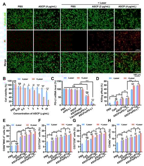 After being cultured overnight, MC38 cells seeded in 6-well plates (5 × 105 cells per well) were transfected with PBS, siPD-L1 only, ASCP/siNC NPs, ASCP/siPD-L1 NPs and Lipo3000/siPD-L1 NPs for 4 h following the methods described in the above siRNA transfection. The final transfected concentration of ASCP NPs was 2 μg/mL and the dose of siRNA was 50 pmol. Next, the cells were irradiated with or without the 808 nm laser (0.5 W/cm2) for 10 min and cultured for another 20 h. Then, the transcription level of the PD-L1 gene of the 24 h post-transfection MC38 cells was investigated using quantitative real-time polymerase chain reaction (qPCR) according to previous experience []. Briefly, the total RNA was extracted from MC38 cells using a TRIzol reagent and quantified using a micro-spectrophotometer (EPOCH-2, Bio-Tek Instruments, Winooski, VT, USA). Then, the total RNA (1 μg) was reversely transcribed to complementary deoxyribonucleic acid (cDNA) by using the QuantiTect Reverse Transcription Kit in accordance with the manufacturer’s instructions. Finally, the mRNA level of the PD-L1 gene was measured by a qPCR instrument (QuantStudio-1, Appliedbio systems, Waltham, MA, USA) by using the Bestar SybrGreen qPCR Master Mix, followed by normalizing to the expression of GAPDH.