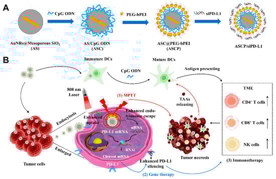 AuNRs and AuNRs@MS (AS) were prepared by using the seed-mediated growth method, as reported by Zhang et al. [,,]. Through the successive surface modification steps of adsorbing CpG ODNs and wrapping them with PEG-bPEI, the co-delivery vector ASCP/siPD-L1 was successfully obtained (Scheme 1A). The morphology of NPs synthesized at each step of the preparation process was measured under transmission electron microscopy (TEM). The aspect ratio of the prepared AuNRs was about 4:1 with a particle size of about 80 × 20 nm (Figure S1). AS NPs were coated with MS shells with a thickness of about 40 nm around the AuNRs core (Figure S2). The abundant pores on the surface of MS shells enabled them to be used as carriers to adsorb a large number of small molecules, such as nucleic acid fragments []. Therefore, CpG ODNs, as short synthetic single-stranded DNA molecules [], could be adsorbed into the pores on the MS shells of AS NPs. Next, the loading capacity of CpG ODNs by AS NPs was tested under the different mass ratios of 1.5:1, 3:1, 5:1, 10:1 and 20:1. The electrophoretic mobility results showed that the adsorption capacity of CpG ODNs to AS NPs reached the upper threshold at the mass ratio of 5:1 (AS to CpG ODNs), (Figure S3). The peak value of UV-vis absorbance spectrum at 260 nm indicated that the CpG ODNs were successfully loaded onto AS NPs to form ASC NPs (Figure S4). Then, the CpG ODNs’ loading efficiency was determined, including the CpG entrapment efficiency and the CpG loading content of ASC NPs. The CpG entrapment efficiency of ASC NPs was increased with the increase in weight ratio and began to reach the upper limit of 98.61% when the weight ratio was up to 5:1 (Figure S5). The CpG loading content of ASC NPs was at the highest at the weight ratio of 3:1 and the second highest at the weight ratio of 5:1 (Figure S5). Considering the results of electrophoretic mobility and the CpG ODNs’ loading efficiency, ASC NPs were prepared at an AS/CpG ODNs weight ratio of 5:1. Coating and modification with positive potential cationic polymers (such as PEG-bPEI) are common means to convert nanoparticles into siRNA carriers [,]. Finally, ASCP NPs were prepared by mixing ASC NPs with PEG-bPEI at the weight ratio of 5:1 and by night stirring and centrifugation. Overall, all the AS-based NPs exhibited a typical oval shape with a particle size of about 120 × 60 nm in TEM (Figure S6). The pores in the outer MS shell of the initially synthesized AS NPs were clearly visible. However, with the sequential loading of CpG ODNs and PEG-bPEI to form ASC and ASCP NPs, the pore clarity on the MS shell gradually decreased, especially after PEG-bPEI was wrapped (Figure S6). The mean diameter of AS NPs, ASC NPs and ASCP NPs obtained by dynamic light scattering (DLS) in ultra-pure water was 75.45 nm, 84.67 nm and 95.03 nm, respectively (Figure S7). The corresponding average zeta potential values of these NPs were +23.54 mV, −20.67 mV and +39.38 mV, respectively (Figure S8).