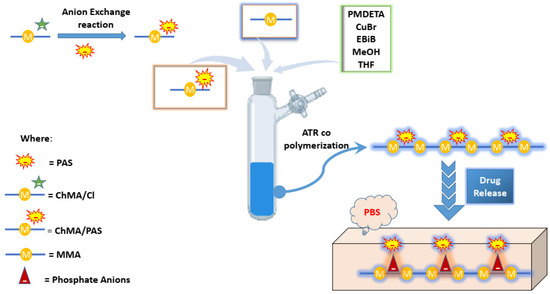 In the present study, the linear choline-based PILs with PAS anions (Figure 1) were synthesized using the pharmaceutically functionalized monomeric IL, that is [2-(methacryloyloxy)ethyl]trimethylammonium p-aminosalicylate (ChMAPAS). This new IL was obtained by the exchange of the chloride counterion in ChMACl with a PAS anion. The pharmaceutical anion was selected because PAS is an antibiotic which prevents Mycobacterium tuberculosis from multiplying and causes them to die. For this reason, it is mostly used to augment the activity of other anti-tuberculosis drugs and to avoid the drug-resistant effect [39,40,41]. The PAS content in the polymer was regulated by copolymerization of ChMAPAS and methyl methacrylate (MMA) in various proportions as well as using different ratios of monomer to initiator in the atom transfer radical polymerization (ATRP). Additionally, the P(ChMACl-co-MMA)s were synthesized to indicate the influence of pharmaceutical anion on the polymerization reaction and the structural parameters of the resulting polymers. The obtained PAS-containing polymers are ionic conjugates, in which the drug anion is connected by an ionic bond with a polymer matrix. Because of that, drug release is based on its exchange generated by phosphate anions in the PBS buffer, which was applied as a factor mimicking the natural environment of the physiological fluid during an in vitro study.