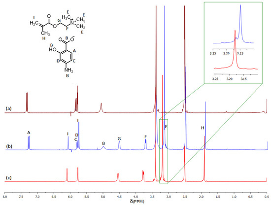 The water-soluble ionic liquid functionalized with polymerizable methacrylate group, i.e., [2-(methacryloyloxy)ethyl]trimethylammonium chloride (ChMACl), was modified with p-aminosalicylate sodium salt (NaPAS) via exchange of the Cl- anion with PAS- to produce a monomer containing a pharmaceutical anion, i.e., [2-(methacryloyloxy)ethyl]trimethylammonium p-aminosalicylate (ChMAPAS) as it is presented in the Scheme 1. The presence of PAS anions is advantageous for the future application in the treatment of respiratory system, including tuberculosis, bacterial sinusitis, acute otitis media, and chronic bronchitis, as well as for the primary treatment of inflammatory bowel disease [33]. The efficiency of exchange reaction in the monomer was calculated by the 1H NMR spectrum (Figure 2) indicating 77%. The shifting of signal E assigned to nine protons in trimethylammonium group from 3.18 ppm to 3.14 ppm because of the counterion change confirmed the incorporation of pharmaceutical anions in the monomer (see magnification in Figure 2).