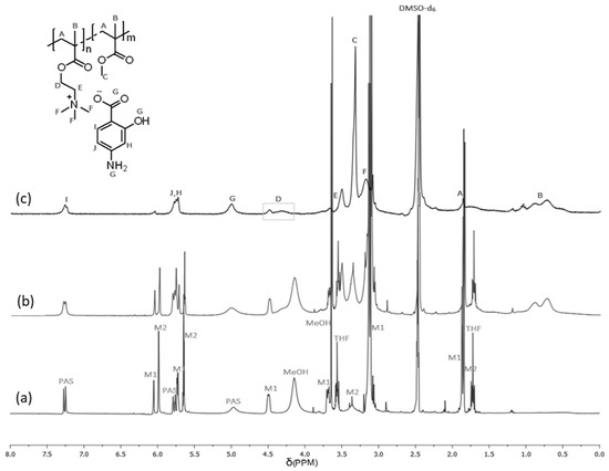 1H NMR spectra of the anion exchange of monomer, sodium salt of PAS (a), PAS after anion exchange (b), and ChMACl before anion exchange (c).