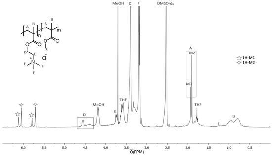 In a Schlenk flask, ChMAPAS (1.5 mmol, 0.53 g) was dissolved in MeOH (0.58 mL), and then MMA (4.4 mmol, 0.47 mL), THF (0.18 mL), and PMDETA (0.015 mmol, 0.003 mL) were added. Next, the homogeneous mixture was degassed by two freeze–pump–thaw cycles, and then EBiB (0.015 mmol, 0.002 mL) as an initiator was introduced to the mixture, and the initial sample was taken out, and the freeze–pump–thaw cycle was repeated one more time. Afterward, CuBr catalyst (0.015 mmol, 0.002 g) was added to the mixture very quickly and the reaction flask was immersed in the oil bath at 40 °C. After 40 min, when a significant increase of the mixture’s viscosity was observed, the reaction was stopped. The sample was taken out to determine the monomer conversions, whereas the rest of the mixture was exposed to the air, subsequently it was dissolved in MeOH (1 mL) and twice precipitated in the chloroform–diethyl ether mixture to remove the catalyst from the polymer. The solvents were evaporated, and finally, the polymer was dried under reduced pressure. Yield: 62%. 1H NMR (DMSO-d6,300 MHz, δ, ppm): 7.3 (1H, –CH in the aromatic ring), 5.6–5.8 (2H, CH in the aromatic ring), 5.04 (2H, –NH2), 4.5–4.2 (2H, –CH2–O–), 3.6–3.4 (2H, –CH2–N+–), 3.45–3.25 (3H, –O–CH3), 3.3–2.9 (9H, –N+–(CH3)3), 1.8–1.5 (2H, –CH2), 1.25–0.3 (3H, –CH3) (Figure 3).