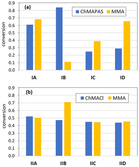 The value of DPn corresponding to the length of polymeric chains shows that they were shorter in the case of ChMAPAS copolymers, which were obtained twice as quickly because of the higher viscosity of the reaction mixture than for analogous ChMACl copolymers, with exception for IA vs. IIA. In the case of PAS copolymers, the conversion of MMA was higher, and it was increased with the initial content of ionic monomer, whereas Cl-based copolymers were attained at similar conversions of comonomers independently on their initial ratios (Figure 5). The variety of relative reactivity ratio of ChMA vs. MMA between both series indicated the influence of the counterion type. The polymers prepared at the ratio of monomer to initiator 400/1 were characterized with the monomer conversion ranging 32–66% detected within a relatively short time of 40–125 min. At a higher initial ratio of monomer to initiator (600/1) used in synthesis of the copolymers IB and IIB, the lower rate of polymerization can be concluded due to significantly longer reactions yielding 31% and 65% of monomer conversion after 19 h and 5 h, respectively. Larger amounts of monomers in relation to the initiator in the reaction mixtures of IB and IIB had an influence on the specific behavior of the ionic monomer in relation to the MMA comonomer showing differences in conversions within the monomer pair for the studied system, i.e., XChMAPAS ≫ XMMA (IB) vs. XChMACl < XMMA (IIB). Comparing IB-IIB and IA-IIA with the same molar ratio of ChMA/MMA (25/75), but different monomer/initiator ratio (600/1 and 400/1, respectively), in the latter systems both monomers were incorporated into the polymer chains at similar conversions, i.e., XChMAPAS or XChMACl~XMMA. At higher initial ratios of ChMA/MMA monomers, that is 50/50 (systems C), and 75/25 (systems D), differences in correlation of monomer conversions in the systems I with ChMAPAS were observed, showing a trend for increasing MMA conversion (XChMAPAS < XMMA) with increasing initial content of ionic monomer (Figure 5). In the case of the systems IIC and IID with ChMACl, the conversions of both monomers were similar (XChMACl~XMMA).