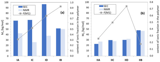 Dependence of MnNMR vs. MnSEC on content of ionic fraction in the series of PAS- (a) and Cl-based polymers (b).