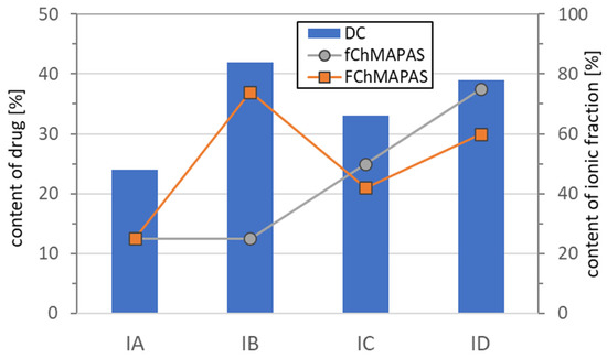 The percentage amount of PAS included in the copolymer as the drug content (DC) was evaluated by UV-Vis spectroscopy. The amount of PAS, which was introduced by polymerization of the pharmaceutically functionalized monomer (ChMAPAS), was increased with the content of ionic units in the polymer (Figure 7). DC values ranged at 24–42%, but polymer IC seems to be the most advantageous system because the amount of drug contained in the polymer (DC = 33%) was well correlated with the initial content of PAS monomer in the reaction mixture and PAS unit content in the polymer (fChMAPAS = 50% and FChMAPAS = 42%). Additionally, the use of initial monomer ratio with a dominant amount of ChMAPAS (ID) did not guarantee the proportionally larger content of drug in the polymer (DC = 39%), which was limited by steric hindrance of the pharmaceutical anion in the monomer. Another effective option to attain similar drug content (DC = 42%) was the more diluted reaction mixture IB by the initial ratio of monomer to initiator (600/1) at the initial proportion of ChMAPAS/MMA equal to 25/75 which was beneficial for almost full conversion of the ionic monomer.