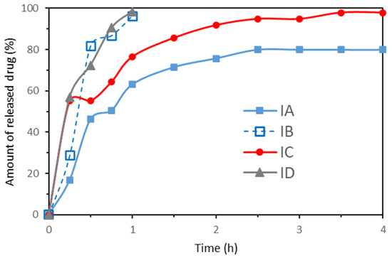 The in vitro drug release was measured using UV-Vis to monitor the exchange of PAS anions with the phosphate anions in the PBS solution. The kinetic profiles demonstrated a dramatically high rate of PAS, especially for samples ID and IB, where above 80% was released within one hour (Figure 8). The specificity of these systems was correlated with the compositions of polymers obtained at the highest initial ratio of ChMAPAS/MMA leading to a significantly higher conversion of MMA than ChMAPAS (ID) or with a higher ratio of monomer/initiator yielding an extremely high conversion of ionic monomer (IB). In those cases, higher rigidity of the formed chains appeared to be convenient for the increased repulsion effect, making the anions readily available during the exchange reaction by leaving the ionic group exposed to the environment. For the other systems IA and IC, the drug release was slower, removing 80–100% of PAS after 4 h, and the continuation of process for the sample IA until 24 h led to 100% of the final amount of released drug. These results confirmed that the release rate depends on several factors, including polymer structure, interactions between the bioactive anion and the polymer matrix, as well as between bioanions. However, the kinetic release profile for the IC polymeric carrier seems to be the most interesting for prolonged drug delivery due to the well-controlled release process and the effective amount of released PAS.
