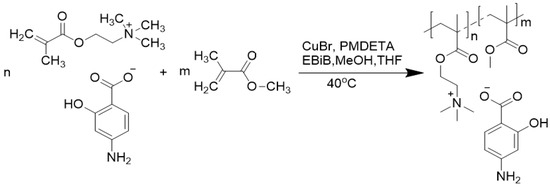 Methyl methacrylate (MMA, Alfa Aesar, Warsaw, Poland) was dried by molecular sieves under argon. [2-(Methacryloyloxy)ethyl]trimethyl-ammonium chloride (ChMACl, 80% aq. solution, Sigma-Aldrich, Poznan, Poland) was dried under reduced pressure until it reached a consistent weight. Copper (I) bromide (CuBr; Fluka, 98%, Steinheim, Germany) was purified by using glacial acetic acid and stirring, then filtered, washed in ethanol and diethyl ether, then dried under vacuum. Ethyl 2-bromoisobutyrate (EBiB), N,N,N′,N″,N″-pentamethyldiethylene-triamine (PMDETA), and phosphate-buffered saline (PBS) were purchased from Sigma-Aldrich (Poznan, Poland) and used as received. Methanol (MeOH, Chempur, Piekary Śląskie, Poland) and tetrahydrofuran (THF, Sigma-Aldrich, Poznan, Poland) were dried using molecular sieves under argon. Sodium p-amino-salicylate (NaPAS, 98%) was used without purification as received from Alfa Aesar (Warsaw, Poland).