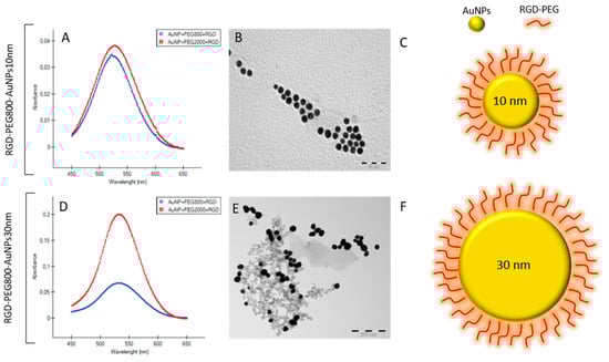 Characterization and morphology of the synthesized AuNPs. (A) UV–VIS spectrum for RGD-PEG800-AuNPs10nm and RGD-PEG2000-AuNPs10nm. (B) TEM image of 10 nm AuNPs, based on the TEM measurements the average size of AuNPs was 10.5 nm +/− 1.3 nm. (C) The scheme of RGD-PEG800/2000-AuNPs10nm. (D) UV–VIS spectrum for RGD-PEG800-AuNPs30nm and RGD-PEG2000-AuNPs30nm. (E) TEM image of 30 nm AuNPs, based on the TEM measurements, the average size of AuNPs was 30.9 nm +/− 1.8 nm. (F) The scheme of RGD-PEG800/2000-AuNPs30nm.
