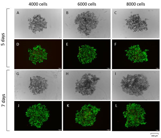 Live/dead assay of the MCF-7 3D model. BC spheres were observed after 5 days of forming in a bright field containing 4000 cells (A), 6000 cells (B), and 8000 cells (C). The identical spheres were tested with the live/dead assay (D–F). After 7 days of formation, identical BC spheres were photographed using the bright field (G–I) and live/dead assay (J–L). The FITC channel was used to present the green alive cells, and the Texas Red channel for the red, dead ones.