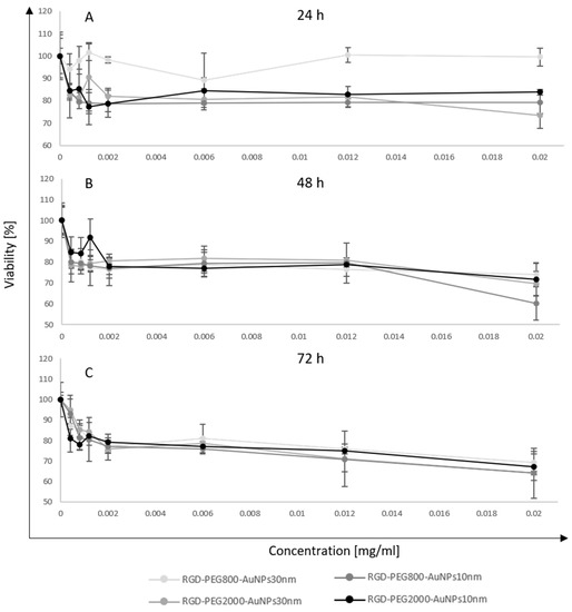 The viability level of the MCF-7 2D model after incubation with AuNPs. In this test, RGD-PEG800-AuNPs10nm, RGD-PEG2000-AuNPs10nm, RGD-PEG800-AuNPs30nm, and RGD-PEG2000-AuNPs30nm were used in concentrations of 0.0004, 0.0008, 0.0012, 0.0020, 0.0060, 0.0120 and 0.0200 mg/mL. The time points of incubation time with AuNPs were 24 h (A), 48 h (B), and 72 h (C).