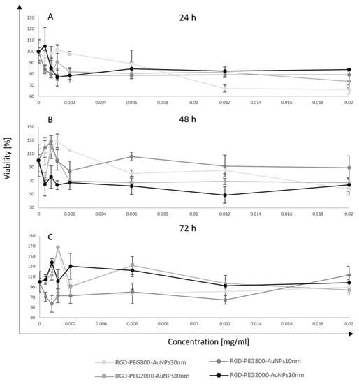 The viability level of the MCF-7 3D model after incubation with AuNPs. In this test, RGD-PEG800-AuNPs10nm and RGD-PEG2000-AuNPs10nm, RGD-PEG800-AuNPs30nm and RGD-PEG2000-AuNPs30nm were used in concentrations of 0.0004, 0.0008, 0.0012, 0.0020, 0.0060, 0.0120 and 0.0200 mg/mL. The time points of incubation time with AuNPs were 24 h (A), 48 h (B), and 72 h (C).
