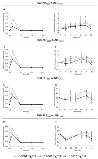 The ROS induction—optimization of the incubation time and AuNP concentration. The preliminary experiments were performed to optimize the TPs of the highest level of ROS generation. The experiment was performed singly ats TP of 30 min, 2, 4, and 6 h incubation with RGD-PEG800-AuNPs10nm (A), RGD-PEG2000-AuNPs10nm (B), RGD-PEG800-AuNPs30nm (C). and RGD-PEG2000-AuNPs30nm (D). The range of 1 h was investigated; thus, the ROS level was checked every 10 min using RGD-PEG800-AuNPs10nm (E), RGD-PEG2000-AuNPs10nm (F), RGD-PEG800-AuNPs30nm (G), and RGD-PEG2000-AuNPs30nm (H).