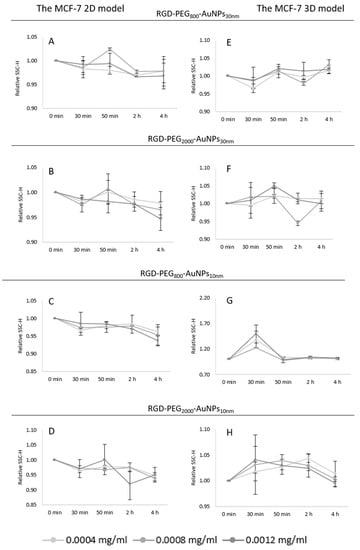 Based on previous work [17], the evaluation of AuNP uptake was established. The experiment assumed that the higher granularity of the cells, the more nanoparticles they incorporated. This parameter was checked by SSC-H analysis using flow cytometry; higher side scatter levels inform on the higher granularity of the cells. For this analysis, the same concentration and TPs were used as in the experiments for the ROS induction level. After incubation with RGD-PEG800-AuNPs10nm, RGD-PEG2000-AuNPs10nm, RGD-PEG800-AuNPs30nm, and RGD-PEG2000-AuNPs30nm, the cells were collected and analyzed using the SSC-H parameter in both cell culture models. The results appeared to be highly heterogeneous. The SSC-H level was too low to assess the uptake of cells in the 2D model (Figure 7A–D) and 3D model (Figure 7E–H). It is likely that this is correlated to the size of the cells and used AuNPs. Considering the level of the standard deviations and SSC-H values, no apparent effect was observed. Only, in the case of the 3D model, the smallest size and PEG chain AuNPs, RGD-PEG800-AuNPs10nm changed the granularity of MCF-7 cells, reaching 1.7 of the relative SSC-H level. Based on these results, there was no information about the TP or concentration changing the granularity of the cells, however, this is not identical to the situation in that the cells did not absorb the AuNPs.