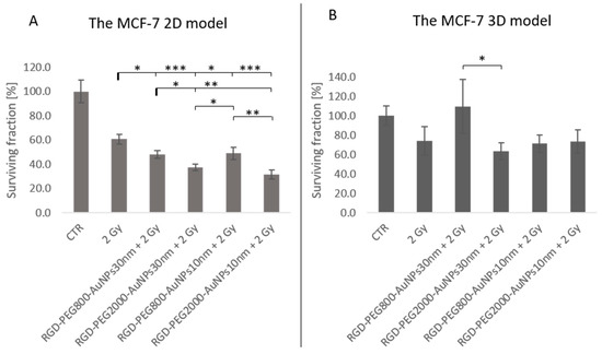 The survival fraction of MCF-7 cells after exposure to a dose of 2 Gy and dose of 2 Gy with the previous 50 min incubation with RGD-PEG800-AuNPs10nm, and RGD-PEG2000-AuNPs10nm, RGD-PEG800-AuNPs30nm, and RGD-PEG2000-AuNPs30nm in the concentration of 0.0008 mg/mL. (A) Results for the MCF-7 2D model and (B) for the MCF-7 3D model. The setting of the p-value * p < 0.05, ** p < 0.01, *** p < 0.001.