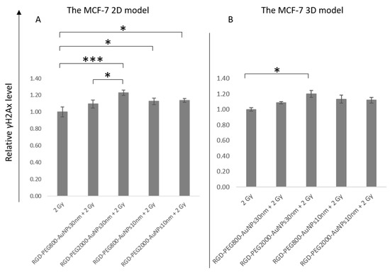 The γH2AX relative level of the MCF-7 cells after exposure to a dose of 2 Gy and dose of 2 Gy with the previous 50 min incubation with RGD-PEG800-AuNPs10nm, RGD-PEG2000-AuNPs10nm, RGD-PEG800-AuNPs30nm, and RGD-PEG2000-AuNPs30nm in the concentration of 0.0008 mg/mL. (A) Results for the MCF-7 2D model and (B) for the MCF-7 3D model. The setting of the p-value * p < 0.05, *** p < 0.001.