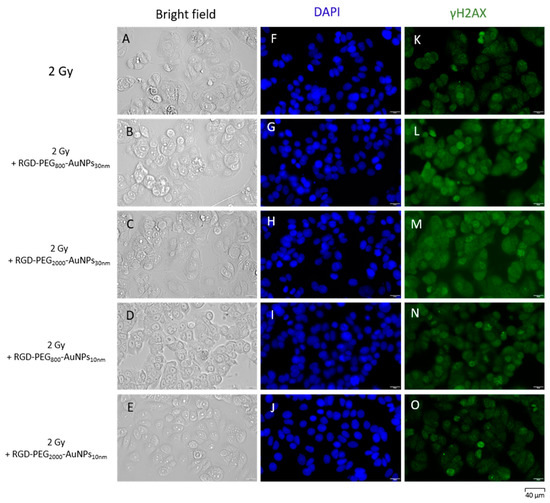 The immunofluorescence of γH2AX after cell exposure to 2 Gy and dose of 2 Gy with the previous 50 min incubation with AuNPs in the 2D model. The morphology of cells was presented in the bright field (A–E). The nuclei of cells were dyed with the DAPI solution (F–J). The γH2AX foci were dyed using the solution in green (488 nm) (K–O).