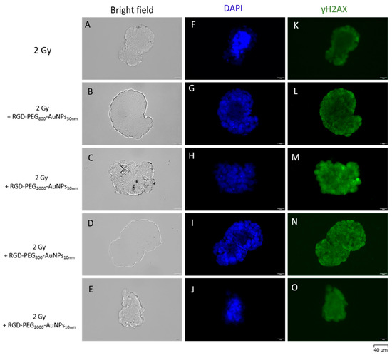 The immunofluorescence of γH2AX after cell exposure to 2 Gy and dose of 2 Gy with the previous 50 min incubation with AuNPs in the 3D model. The morphology of cells was presented in the bright field (A–E). The nuclei of cells were dyed with DAPI solution (F–J). The γH2AX foci were dyed using the solution in green (488 nm) (K–O).