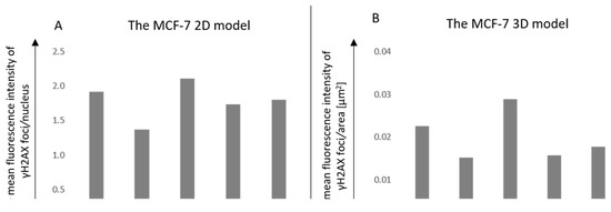 The immunofluorescence of γH2AX was investigated (Figure 10 and Figure 11). After the previous 50 min incubation time of cells with AuNPs, the irradiation in the dose of 2 Gy was implemented. Using the image deconvolution, the quantification of the γH2AX foci mean fluorescence intensity (MFI) was performed (Figure 12). The increase in the γH2AX foci MFI was observed in the MCF-7 model where the RGD-PEG2000-AuNPs30nm were added. In the other variants, a decrease in the γH2AX foci MFI was detected when comparing both the 2D and 3D models, although lower values were noticed using MCF-7 spheres.