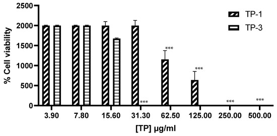 Various TPs have different efficacy in controlling oral microbes [52,53]. This is influenced by their active ingredients. Differences in the antimicrobial activity of TPs have also been reported in other studies [54]. The selected TPs used in the present study also demonstrated microbial growth inhibition on the test oral microbes. Table 1 shows that all the TPs at 500 µg/mL (stock concentration) showed antimicrobial activity in all microbes, in the following order TP-4>TP-2>TP-3>TP-1. The antimicrobial activities of the TPs were not statistically significant in comparison to each other. However, TP-1 and TP-3 had lower ZOI ranging from 7.00 to 9.41 mm across all the tested microbes compared to the other TPs at 7.77–12.91 mm. Therefore, TP-1 and TP-3 were selected for further studies due to their lowest antimicrobial activity.