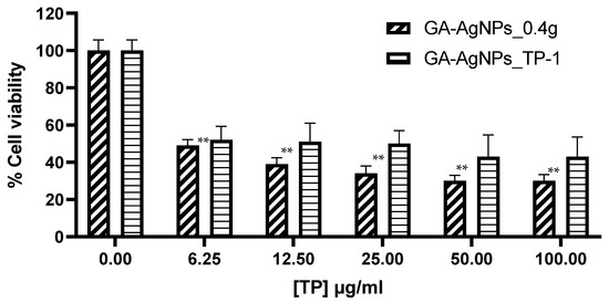 Cytotoxicity effects of GA-AgNPs_0.4g and GA-AgNPs_TP-1 on BMF cells. Cell viability was assessed by MTT assay after treatment for 24 h. p ≤ 0.05 was considered as statistically significant, ** p ≤ 0.01.