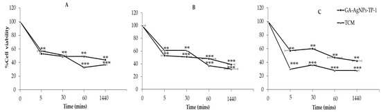 Cytotoxicity effects of GA-AgNPs_TP-1 compared to TCM on BMF cells. Cell viability was assessed by MTT assay after treatment with 25 (A), 50 (B) and 100 (C) µg/mL for various time points up to 24 h. p ≤ 0.05 was considered as statistically significant, ** p ≤ 0.01 and *** p ≤ 0.001.
