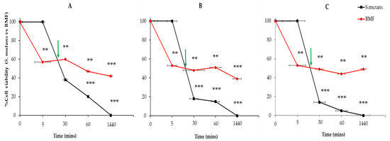Comparison of the survival of S. mutans versus BMF cells after exposure to GA-AgNPs_TP-1. S. mutans and BMF cells were treated with 25 (A), 50 (B) and 100 (C) µg/mL for various time points up to 24 h. Viability was evaluated by MTT assay. The green arrow points at an equivalence point of the GA-AgNPs_TP-1. p ≤ 0.05 was considered as statistically significant, ** p ≤ 0.01 and *** p ≤ 0.001.
