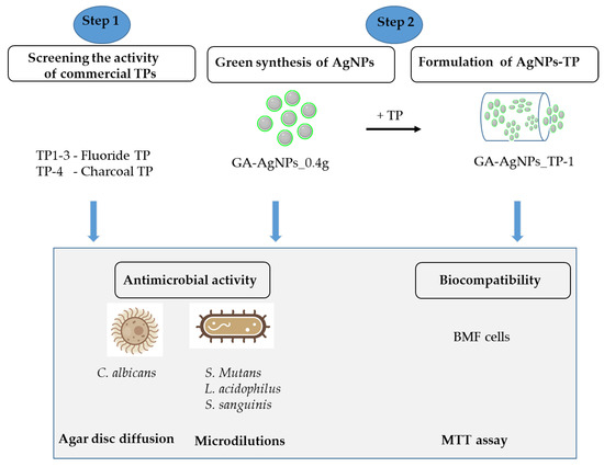 Steps towards GA-AgNPs-TP formulation, investigation of the antimicrobial and cytotoxicity activities. Step 1—screening of commercial TP antimicrobial activity. Step 2—formulation of GA-AgNPs based TP using a TP with least antimicrobial activity.