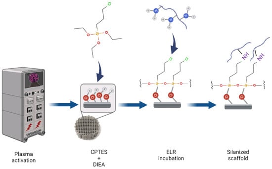 Figure 2 shows a schematic diagram of the process followed to functionalize the scaffolds. The scaffolds were cleaned and activated by an oxygen plasma treatment for 5 min at 12 MHz in a Femto low-pressure plasma equipment (Diener Electronic, Ebhausen, Germany). Samples were then immersed in 0.5 M (3-chloropropyl)triethoxysilane (CPTES) and 0.05 M diisopropylethylamine (DIEA) in anhydrous toluene for 1 h at 70 °C under agitation in a nitrogen atmosphere to avoid the incorporation of water in the solution. The samples were ultrasonically cleaned with anhydrous toluene; washed with toluene, ethanol, isopropanol, distilled water, and acetone; and finally dried with nitrogen. Afterward, the samples were incubated overnight in a solution of 0.05 mg/mL ELR containing 0.5 mM Na2CO3. After incubation, the samples were rinsed thrice in a phosphate-buffered saline (PBS) and blocked with 1 w/v% bovine serum albumin (BSA) in PBS for 30 min. Before cellular assays, the samples were sterilized in 70% ethanol for 30 min and washed with PBS three times. Non-functionalized Ti scaffolds were used as the control.