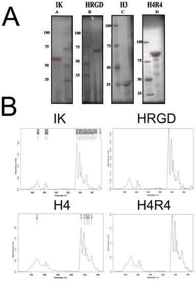 Characterization of the purity of ELRs. (A) SDS-PAGE of purified ELRs. The MW of the SDS-PAGE protein marker bands is indicated on the left side. The bands corresponding to the purified ELR are included in a red box. The theoretical MW for IK, HRGD, H3, and H4R4 are 52 kDa, 60.7 kDa, 31.9 kDa, and 80.7 kDa, respectively. (B) FTIR spectra of the purified ELRs.