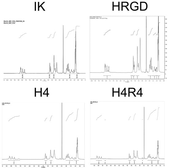 The degree of purity was also corroborated by the acquisition of the infrared spectra (Figure 3B). The correspondence of the ELRs’ profiles was verified, and undesired contaminants were not detected. In addition, the proton NMR spectra (Figure 4) confirmed the ELRs’ purity and identity by the determination of the relative amount (ratio) and absolute content of amino acids [].