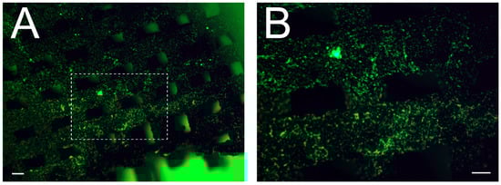 In previous works, we demonstrated that the use of silanes, specifically 3-chloropropyltriethoxysilane (CPTES) or 3-aminopropyltriethoxysilane (APTES), enables the covalent immobilization of ECM proteins on plasma-activated Ti surfaces [,,,]. Herein, we verified that the same strategy could be applied to 3D-printed Ti scaffolds since, after crushing the sample, we observed fluorescently labeled HRGD distributed throughout the scaffold (Figure 5A). In high-magnification images, we observed that the HRGD was homogenously distributed along the Ti filaments (Figure 5B). Since the linking mechanism between HRGD and CPTES silane is through the lysine in the elastin-like repetitions of the former, we assumed that all the different studied ELRs were also homogeneously distributed throughout the Ti scaffolds.