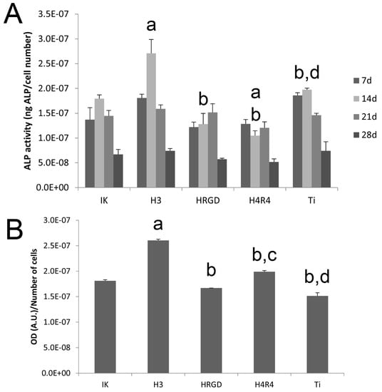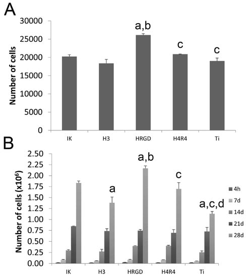 Cell adhesion at 4 h (A) and cell proliferation (B) of rMSCs on the different functionalized and non-functionalized (Ti) scaffolds. At each time point, “a” indicates statistically significant differences compared to IK, “b” indicates statistically significant differences compared to H3, “c” indicates statistically significant differences compared to HRGD, and “d” indicates statistically significant differences compared to H4R4.