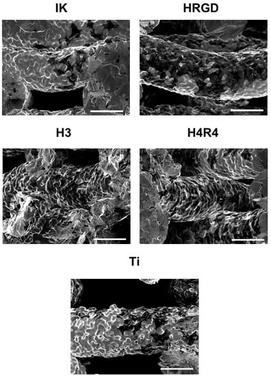 Representative SEM images of the different functionalized and non-functionalized Ti scaffolds showing attached cells 4 h after cell seeding. Scale bars denote 200 µm.