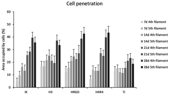 Quantification of the area occupied by cells on the parallel fourth and fifth filament (from the top downwards) at 7, 14, 21, and 28 days after rMSCs seeding on the different functionalized and non-functionalized Ti scaffolds.