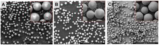Scanning electron images of the 152Sm2(CO3)3-PMA microspheres both before (A) and after 6 h (B) and 18 h (C) neutron activation.