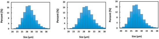 Figure 2 shows the SEM images of the Sm2(CO3)3-PMA microspheres before and after neutron activation. The Sm2(CO3)3-PMA microspheres were spherical and had a smooth surface, both before and after neutron activation. The structural integrity of the 153Sm2(CO3)3-PMA microspheres remained stable after 6 and 18 h neutron activation (Figure 2). Figure 3 shows the size distribution of the Sm2(CO3)3-PMA microspheres before and after neutron activation. The mean diameter of the 152Sm2(CO3)3-PMA microspheres was 29.3 ± 0.18 µm. No size reduction was observed after 6 and 18 h neutron activation. Overall, the size distribution of Sm2(CO3)3-PMA microspheres was remained within 20–40 µm both before and after neutron activation.