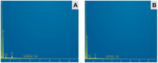 The EDX spectrum of the Sm2(CO3)3-PMA microspheres before and after neutron activation (Figure 4) indicated the presence of chemical elements carbon (C), oxygen (O), samarium (Sm) and sulphur (S), corresponding to the chemical elements present in the PMA microspheres and 152Sm2(CO3)3. Due to the limitation of EDX spectroscopy to detect elements with atomic numbers lower than 6, the element hydrogen (H) was not detected in the spectrum. No residual sodium (Na) or chloride (Cl) from the reagents [SmCl3 and Na2(CO3)] used during preparation were found in the samples. In accordance with the gamma spectrometry, no elemental impurity was observed in the 153Sm2(CO3)3-PMA microspheres. The EDX spectroscopy indicated ~3.5% of 152Sm in the 152Sm2(CO3)3-PMA microspheres.